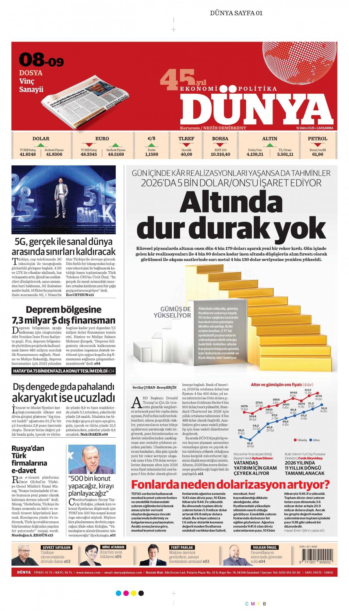 Dünya Gazetesi 15 Ekim 2025 Günü Manşeti