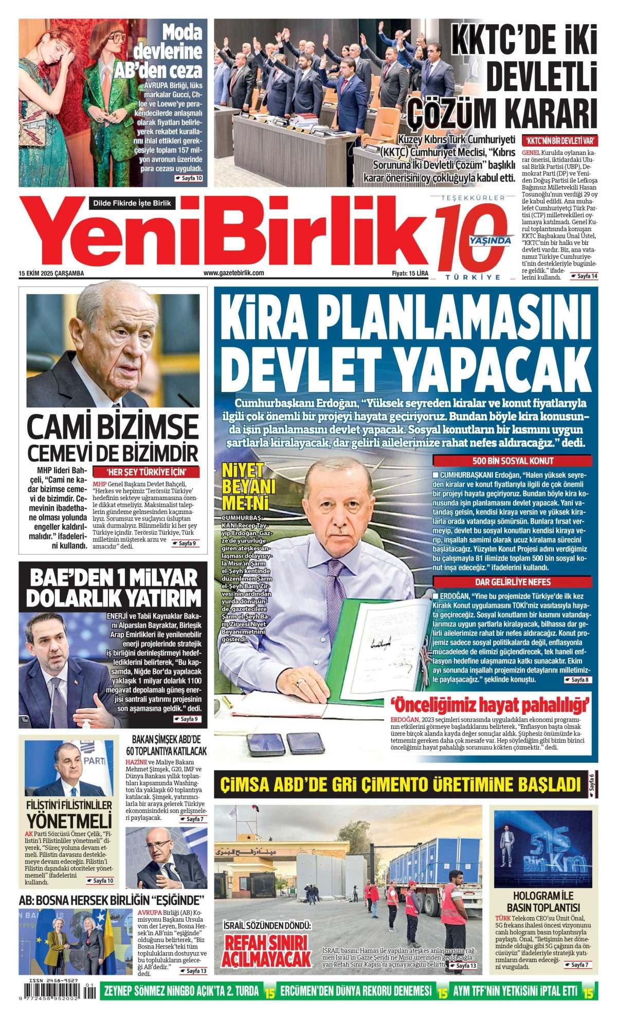 Yeni Birlik Gazetesi 15 Ekim 2025 Günü Manşeti